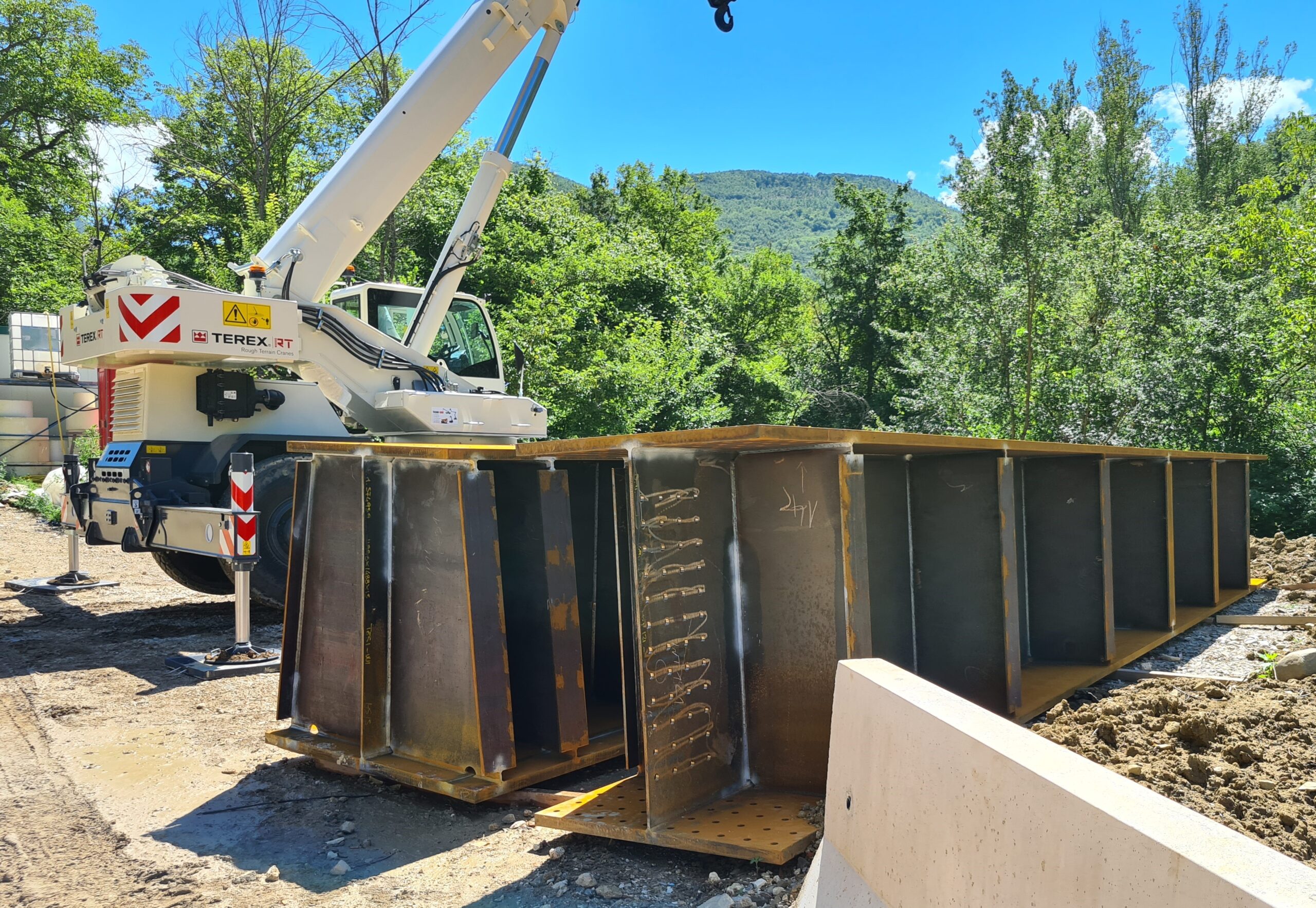 L’impalcato del ponte, suddiviso in 8 elementi, è stato realizzato ed è già stato stoccato in cantiere.
