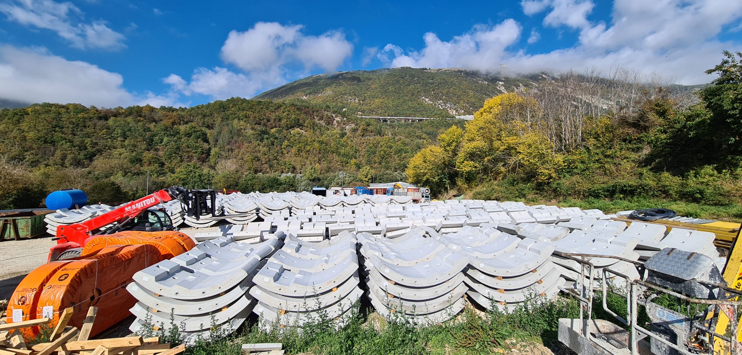I piazzali e le strutture sono pronte per alloggiare personale, materiali e mezzi d’opera. Nel piazzale principale sono stati stoccati i conci prefabbricati da utilizzare per la realizzazione della galleria di Grisciano